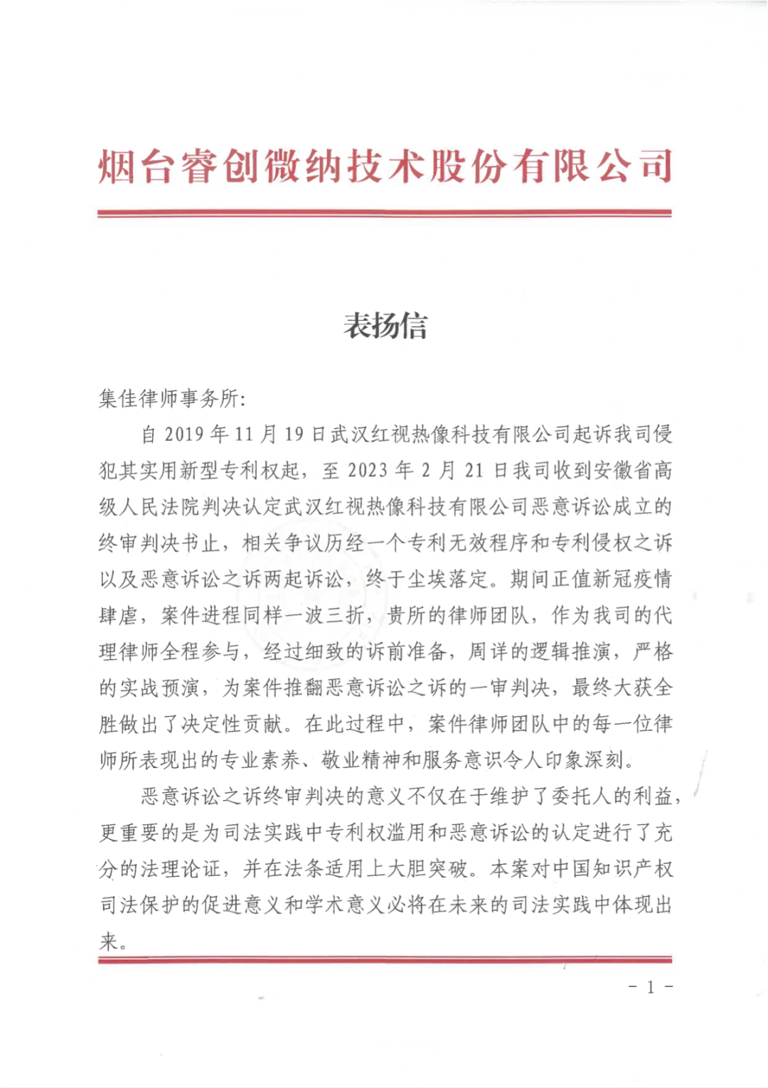 2023年2月10日,安徽省高级人民法院就烟台睿创微纳技术股份有限公司、烟台艾睿光电科技有限公司、安徽英睿系统技术有限公司等(下称“睿创集团”)与武汉红视热像科技有限公司(下称“武汉红视”)因恶意提起知识产权诉讼损害责任纠纷一案作出终审判决,认定武汉红视滥用诉权的行为构成恶意诉讼,并判令其赔偿睿创集团相应的合理支出。至此,时隔四年,横跨疫情时代的专利侵权及恶意诉讼系列纠纷案,终于尘埃落定。开云协助睿创集团最终取得系列案件的全面胜利,维护了客户合法权益,实现了商业竞争的公平正义!